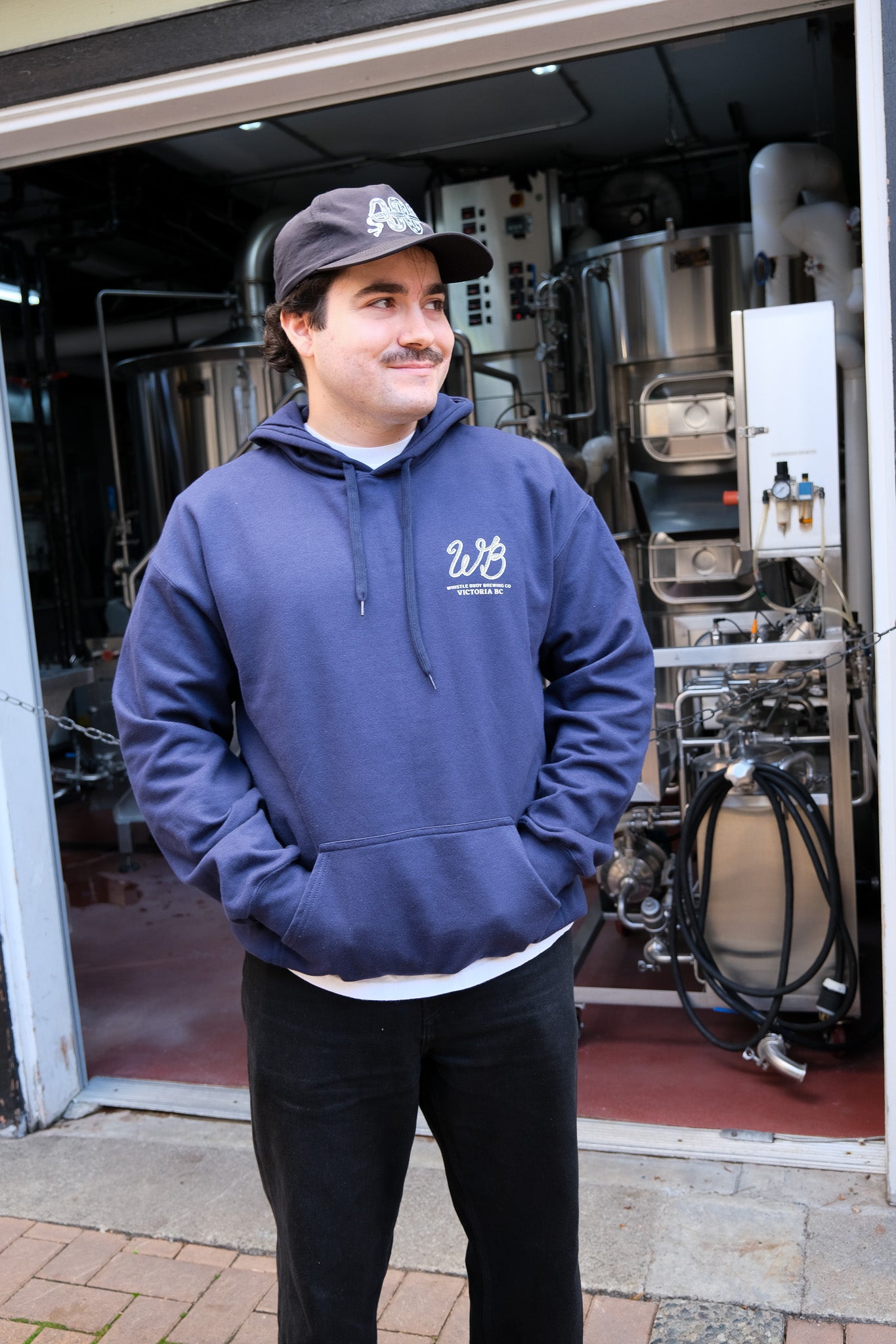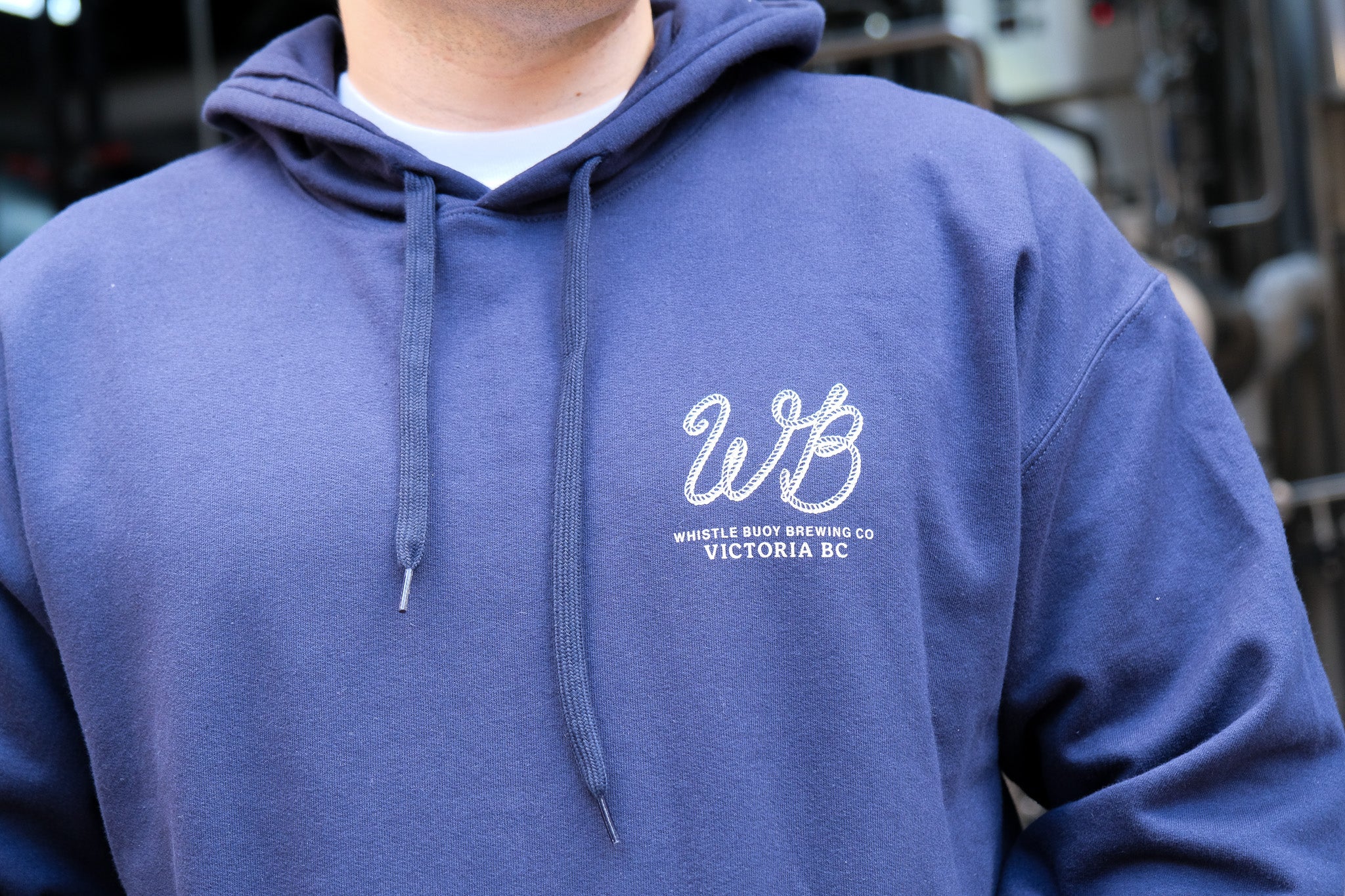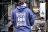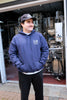 Mid weight navy hooded cotton sweatshirt with Wild Card graphic on back and WB rope logo on left chest